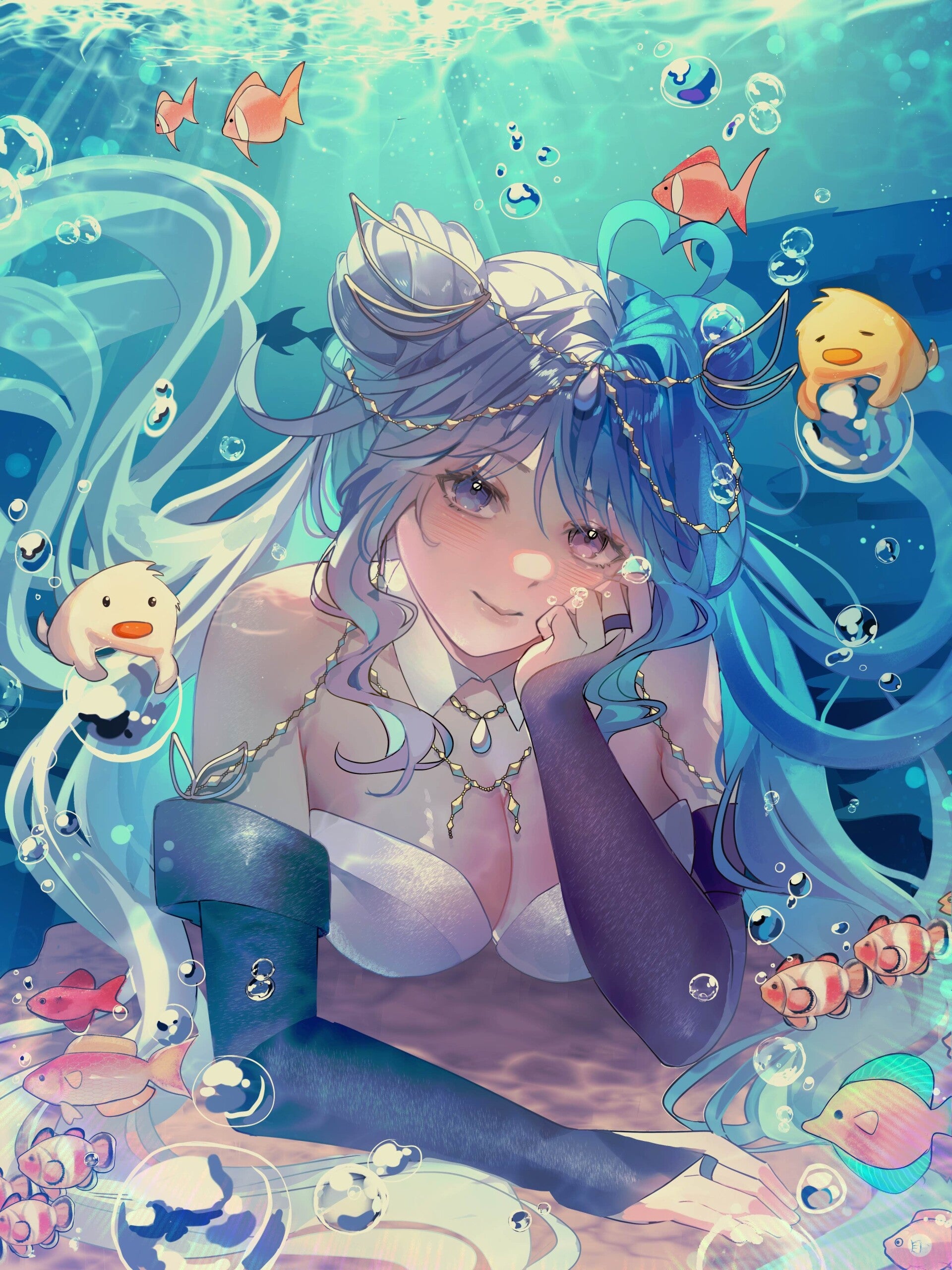One day, Bubbles met two lost ducks named Suds and Squeakers, who told her about something called VTubing—a way humans could appear online as animated characters. Excited, Bubbles decided to try it. With a waterproof tablet and help from clever octopuses, she created her virtual persona: Bubbles Wailoa, a bubbly island girl with sea-green eyes and shell-filled hair.